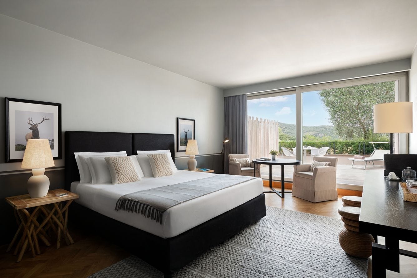 The Tuscan Junior Suite where we stayed during our time at the resort, was the perfect embodiment of the refined elegance that Argentario offers. With its airy, spacious design, it felt like nature carved out a sanctuary just for us. The large windows framed sweeping views of the lush hillsides and gateway to the Mediterranean Sea, blurring the lines between indoors and outdoors. Every detail of the room seemed thoughtfully curated, from the warm tones of the reclaimed wood to the luxurious cotton sheets that beckoned you to sink into them at the end of each day. There was a comforting simplicity to the space, a quiet luxury that was both inviting and calming. The suite offered rejuvenation, a place to unwind, rest, and recharge.